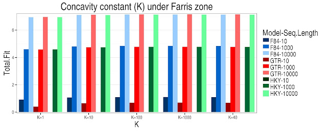 In the Felsenstein and Farris zone can be seen that under the same model and the same sequence length there is an increase in the value of Total Fit as it increases the value of concavity constant (K). In general as the sequence length increases under the same model there is an increases in the Total Fit. In the Felsenstein zone is noted that under the model GTR-10 the Total Fit is zero with differents K values, for models F84 -10 y HKY-10 have a Total Fit of 1 under differents K values. The highest Total Fit values are under the model F84-10000 (Fig 1). In the Farris zone the models with the smallest sequence lengths have the lowest Total Fit values and these in turn decrease as the K value decreases and the models with longest sequence length have the highest Total Fit values as the K value increases (Fig 2).